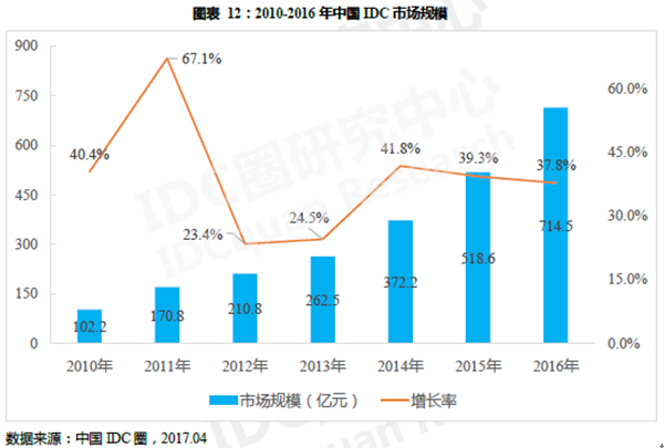 2016年中国IDC市场继续保持高速增长,市场总规模为714.5亿元人民币,同比增长37.8%.近年来 , 国内电信运营商加大了对带宽的投资力度,电信网、广电网和互联网的融合进一步加速,"互联网+"推动传统行业信息化发展,由此带动IDC机房需求和网络需求持续增长。移动互联网和视频行业呈现爆发增长,游戏等行业增速稳定,这些领域客户需求的增长拉动了IDC市场整体规模。