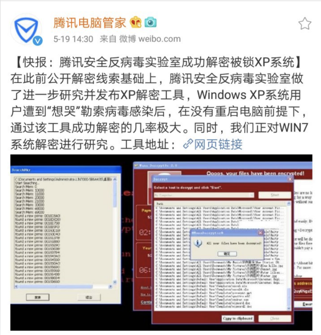 腾讯安全反病毒实验室负责人马劲松表示,关于Windows XP 系统解锁的研究,此前已有安全同行发表了进展,Adrien Guinet首先发现了在XP环境某些条件下,使用CryptDestroyKey和CryptReleaseContext时不会将生成的RSA密钥从内存中销毁,通过搜索目标进程内存的方式,可以搜索到RSA密钥的某些痕迹,但其没有对解密结果进行广泛验证。