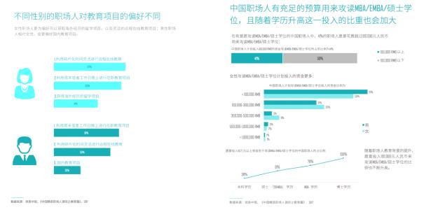 此外,领英还发现,国人再深造并非图高薪,激烈竞争下技能提升成首要动力。与海外调查中呼声最高的“获得更高薪资”不同,中国职场人在选择教育项目时,更看重的是职业生涯的自我提升和丰富,其次才是较为现实的薪酬晋升。在偏好的教育方式上,不占用工作时间的在职教育项目更受欢迎,高达61%的中国职场人渴望利用周末或工作日晚上进行在职教育。不过,国人自我教育投资的性别差异也尤为显着:女性比男性更舍得花钱投入。