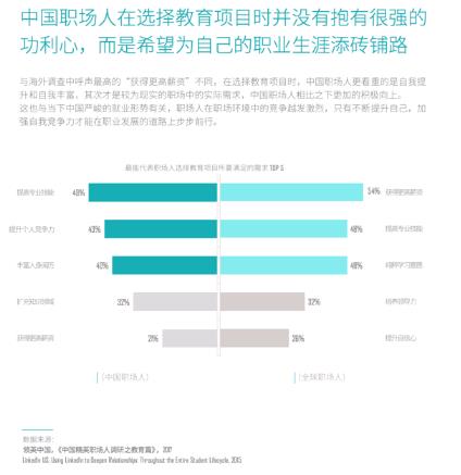 领英报告显示,98%的中国职场人工作后有意愿进行学习提升,而美国人的这一比例只有49%;同时,有65%的中国人计划在未来一年内付诸实践,也远高于美国职场人51%的比例。强烈的深造和求学意愿下,中国职场人对自我教育的投资绝不吝啬,且行动力超强。数据显示,中国职场人从产生念头到真正缴费的平均决策时间仅为100天。而市场调研机构华通明略(Millward Brown)发布的一项有关全球消费者决策历程的报告显示,通常从人们有意向要接受MBA等高等教育到最后入学要经过600天的决策期:可见领英上的中国职场人对于进行教育投入的意愿更强烈和果断。