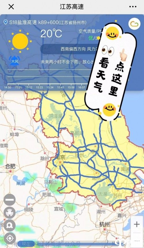 “江苏高速”是一个可以实时查看全省高速路况的微信公众号,现在进入公众号菜单栏底下的【江苏高速】,点击右上角的“一朵云”,即刻出现彩云天气地图,就可获得两小时内分钟级的天气预报,想看哪里点哪里!这个天气地图就是彩云天气的降雨雷达图,图上绿色降雨带能显示即将到来的降雨的大小和风向。