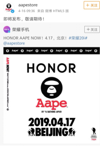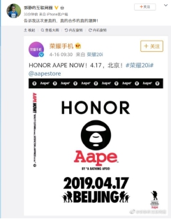 4月16日,@荣耀手机发布了HONOR、AAPE双方品牌的联名海报,并配文:“HONOR AAPE NOW!4.17,北京!#荣耀20i#”。随后潮牌AAPE转发微博。这是继3200万AI拍照之后, 2019年荣耀首款机型荣耀20i再次传出重磅消息,此举意味着荣耀20i将迎来与潮牌AAPE的跨界合作。