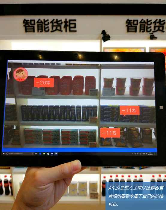 在智能货架区域,可以看到有消费者正举着平板对准货架,这就是专属价格解决方案。通过面部识别技术准确识别顾客后获取该顾客的会员等级,使用平板扫描货架后,系统根据会员等级显示专属于该顾客的会员价格。一方面商家可以借助这些技术打造千人千价的会员体系,另一方面相比目前张贴优惠信息在货架上,这种AR的呈现方式使顾客能够更为直观地获取会员价格。