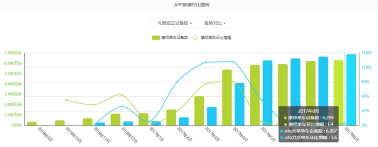 数据显示,ofo月度独立设备数已增长至6887万,排名行业第一;摩拜为6299万台,排名行业第二。且根据8月日均活跃用户增长趋势来看, ofo8月在领先的前提下整体增速更快,环比增帽3.6%,而摩拜仅为1.4%增速现迟缓颓势。再结合艾瑞1-7月数据趋势可知,ofo活跃用户规模自5月超越摩拜之后,已经是连续第4个月领先摩拜,摩拜发展乏力,后劲不足态势日益明显。