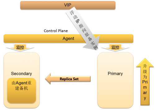 2、当 Primary 实例发生故障时,副本集会发起自动选主,将 Secondary 实例升为 Primary,浮动 IP 切换至新的 Primary 上。