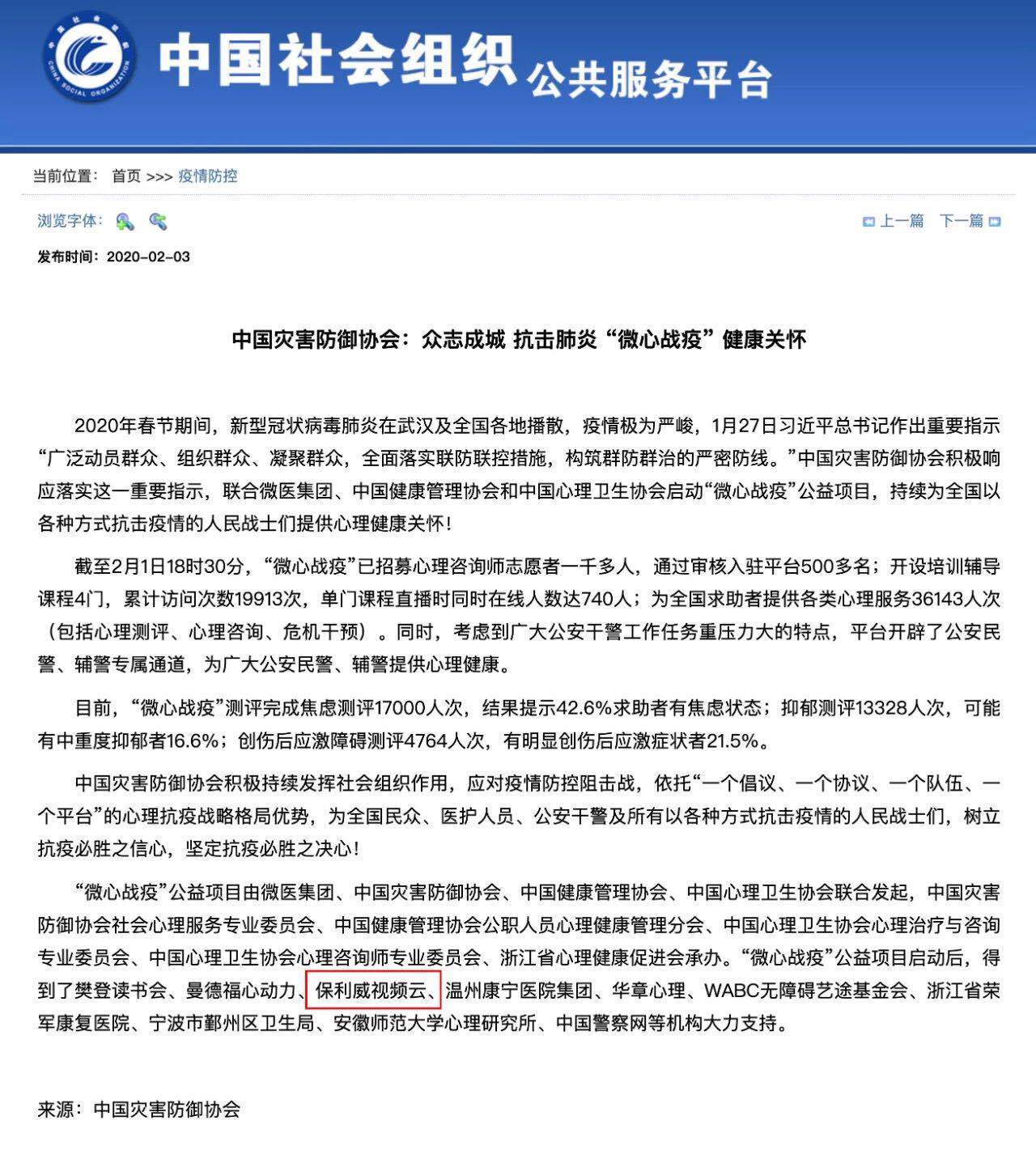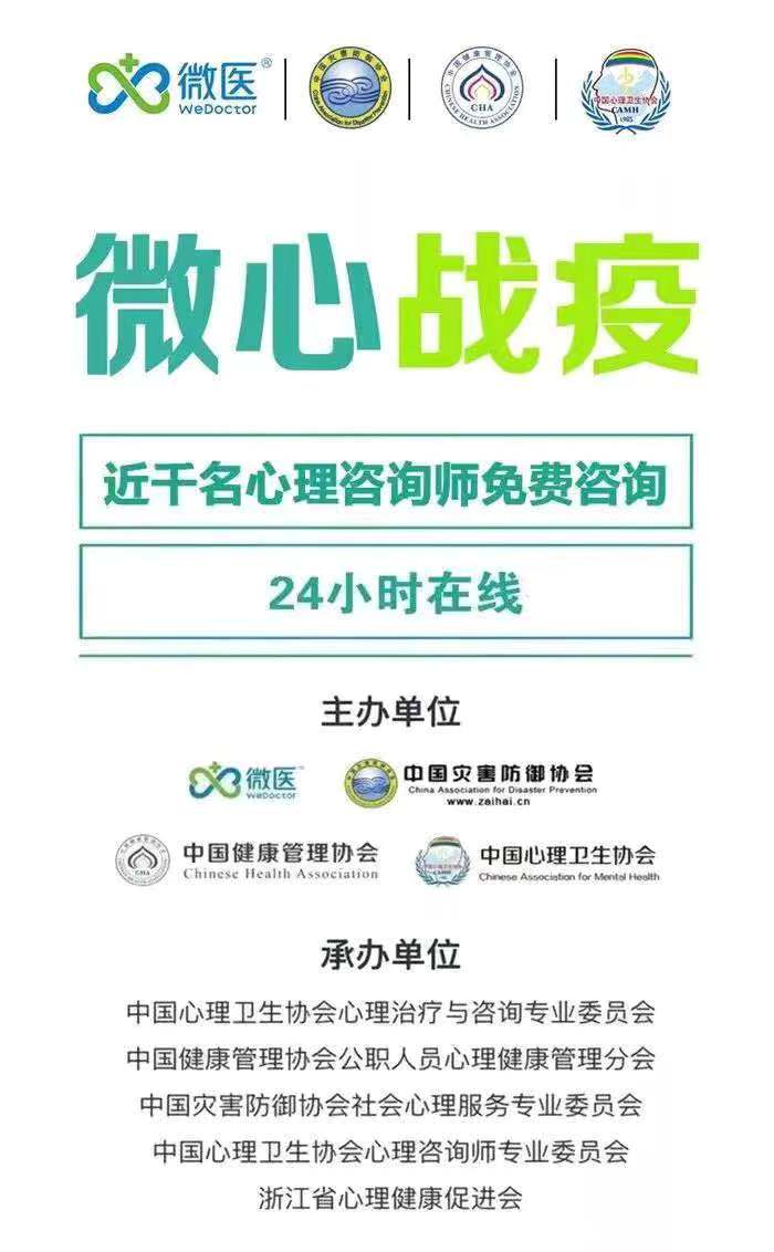 中国灾害防御协会联合微医集团、中国健康管理协会和中国心理卫生协会,启动“微心战疫”公益项目,在微医互联网总医院开设心理援助专区,为全国民众、医护人员及公安干警提供心理健康关怀,通过线上咨询的方式支持处在焦虑中的民众。