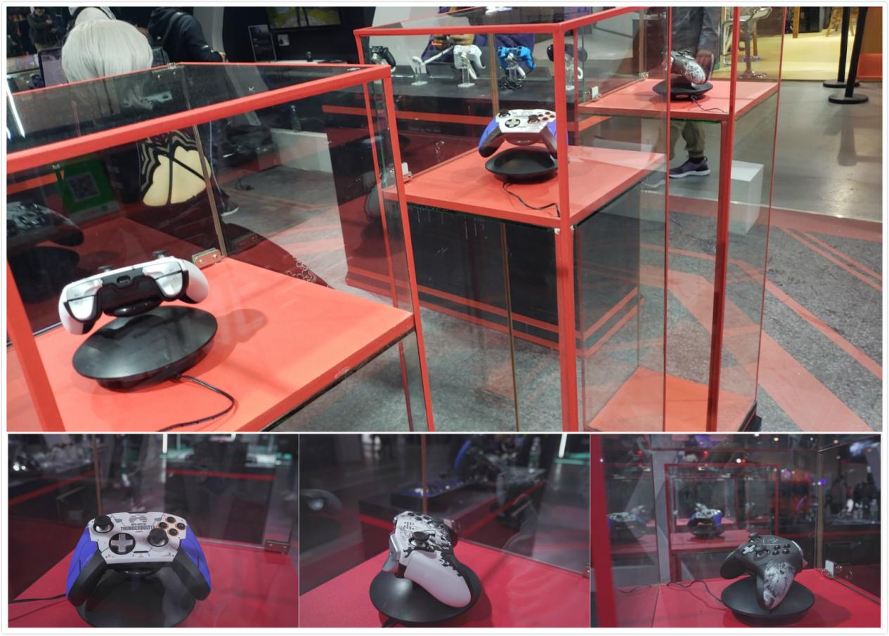 过往的一款款北通产品的积累与沉淀,从而诞生出诠释“智能与机械”的全新北通旗舰产品——北通宙斯游戏手柄,展位内也为此款新品预留了充足的展示空间。先是在主干道正侧的展柜对手柄作了细致的拆分展示,除了外部组件外,更可清晰地看到其主板、马达、各动作按键等内部组件的详尽构成,大家可由内致外地充分感受其中蕴藏的高端精密的精英品质。