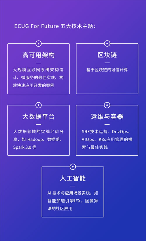本次会议将聚焦五大技术主题,包括:高可用架构、区块链、大数据平台、运维与容器、人工智能。