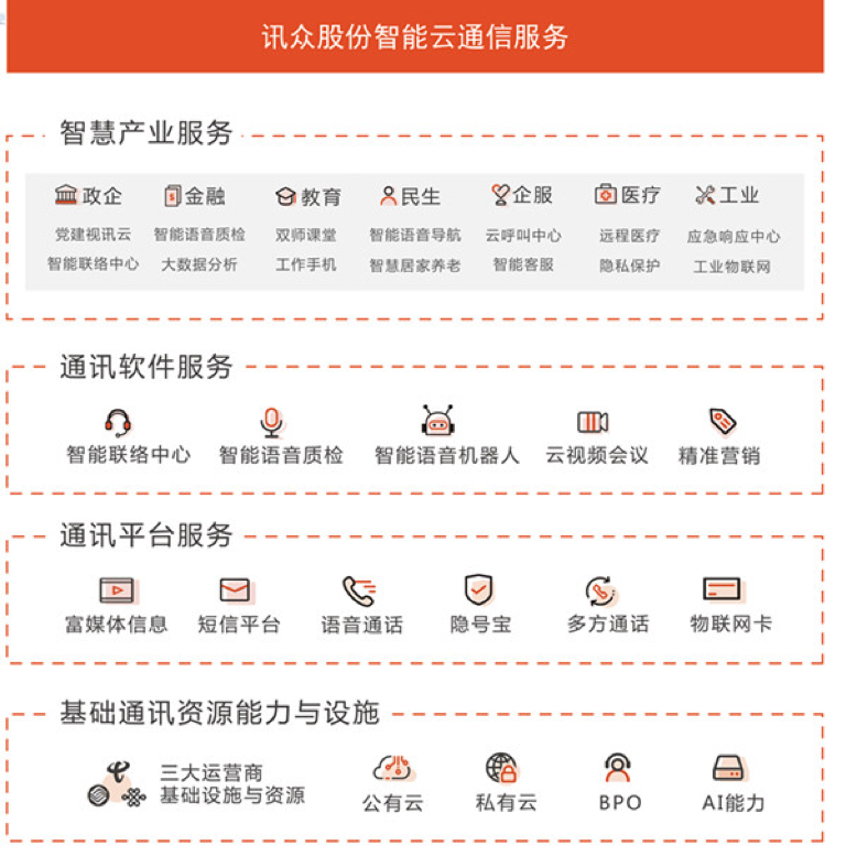 讯众股份近年来围绕企业通信领域逐渐建立起相对完备的产业链:在PaaS端,讯众提供云通信平台,帮助企业快速集成语音、短信、视频等通信能力;在SaaS端,讯众提供智能联络中心、智能语音质检分析、新一代的视频云和智能会议硬件,以及BPO,服务大型金融、保险、互联网企业、教育和政府机构;在DAAS端,讯众可为企业提供营销管理以及微信用服务。