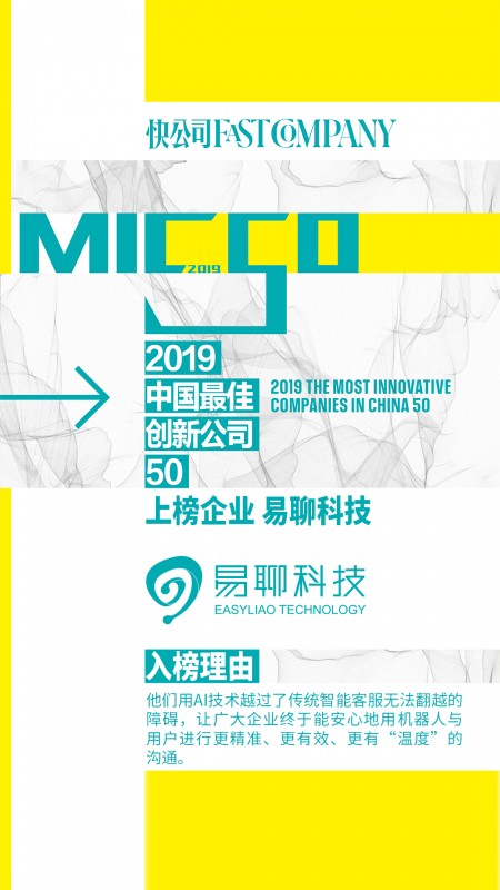 秉承着同样的思路和理念,《快公司FastCompany》中文版“中国最佳创新公司50”的评选,每年在中国数千家公司中逐一筛选,寻找具有创新基因并将想法付诸实施的佼佼者,已成为观察中国创新的风向标之一。上榜的企业无论在业务模式、商业模式,还是新技术展现上都是行业典型。而易聊科技正是智能客服领域的创新代表。