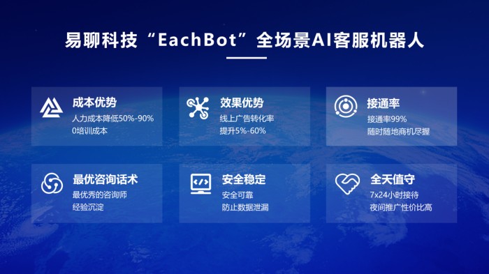 作为智能客服领域的创新者,易聊科技推出了国内首款针对售前营销场景且可实际落地应用的“EachBot” AI客服机器人,率先启动了一个数百亿规模的智能客服机器人市场,并作为一个创新品类客服机器人实现了为企业助营销、增效益、降成本的全新商业价值。
