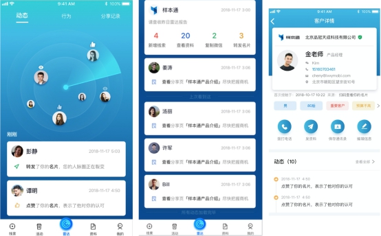 为市场与销售人员量身定制的智能名片功能,可完美取代纸质名片,和“智能样本”无缝结合使用,更有效提高销售人员首次触及客户的破冰效果,同时有效解决销售线索归属的问题。
