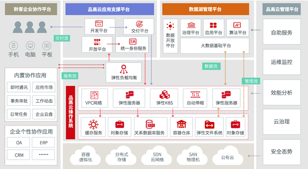 在10月24日举办的品高云2019年度“行业+云”发布会中,品高云V9.0国产全栈云解决方案全面亮相,包括IaaS、PaaS、DaaS、SaaS以及CMP(云管理平台)五大产品系列,覆盖从开发、部署到交付、运维、运营等全方位业务;打通iOS、Android、Web端、PC桌面等各类移动终端,提供全方位的云服务解决方案。