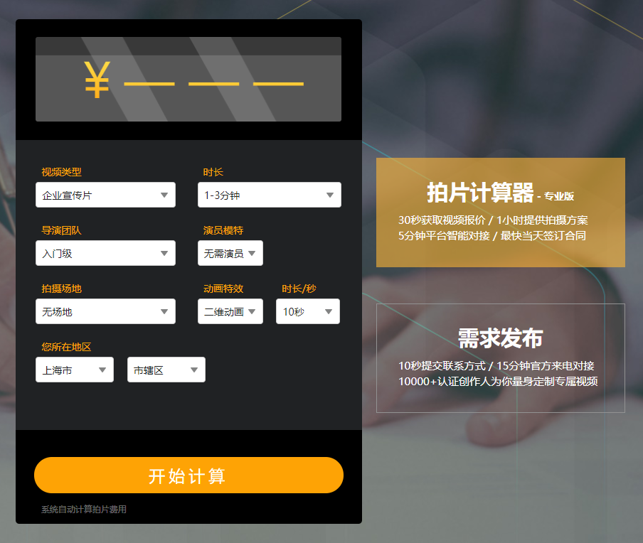 在这里,使用拍片计算器,只要将您的具体要求一一输入,仅需30秒,后台会根据当下行业行情及地区差异,为您获取准确的视频报价,更有耐心官方在线为您答疑解惑。