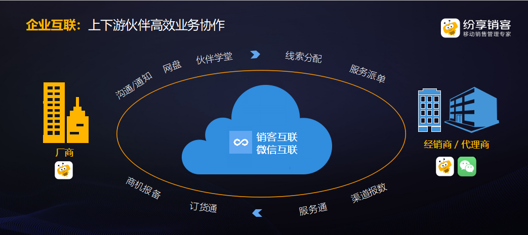 纷享销客连接型CRM其核心就是互联与赋能,构建客户为中心的企业数字化经营体系,帮助企业实现从内部到外部,从管理到业务的升级和赋能,完成整个业务生态体系的互联互通。