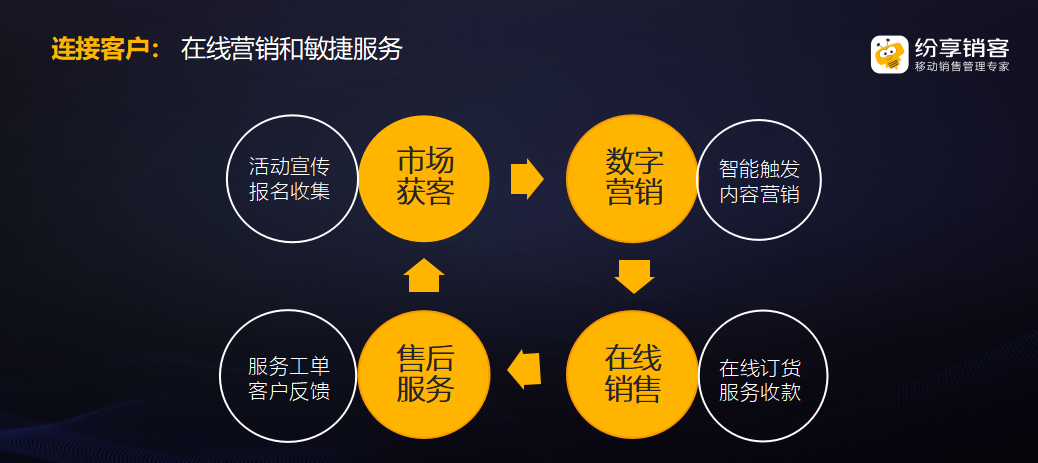其三,连接客户。市场活动中,从市场获客、数字营销、在线销售,到售后服务,再到市场获客,四者之间形成了一个集在线营销和敏捷服务于一体的完美闭环。企业客户可以将CRM+小程序互联,在微信社区进行营销;纷享服务号与微信服务号相连接,可为客户提供专属的顾问服务;同样,CRM服务通与微信服务号相连后,可为客户进行在线服务,从扫码提单、服务申请填写、上门服务提醒,到现场服务缴费、服务评价,环环紧扣,便捷高效。