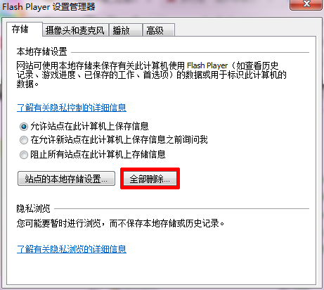 然后在flash player设置管理器中点击全部删除按钮。