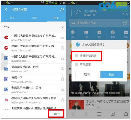 手机虽然是一个很隐私的设备,但是注意保护自己的隐私也是很必要的。浏览一些网页的时候,想及时清理掉“浏览记录”,只需要在推出UC浏览器的时候,勾选“清除浏览记录”即可。或者在“书签/收藏->历史”里面点击“清空”。