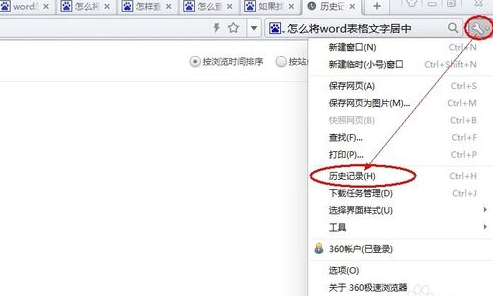 2、以极速360浏览器为例,打开最右边“自定义和控制360极速浏览器”工具按钮,找到历史记录栏目,打开即可。