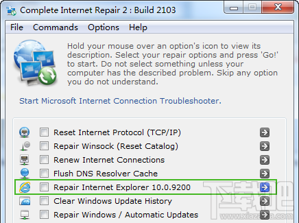 如果方法一搞不定,就只能卸载重装IE浏览器了,具体的教程可参考如何卸载IE浏览器 IE浏览器删除图文教程。如果重装IE浏览器还是搞不定,那么就可以死马当活马医,打开”Complete Internet Repair“,勾选所有选项,然后点击【Go!】按钮,修复完成后重启电脑。