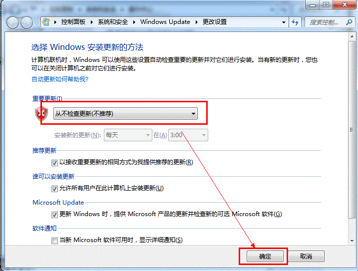 步骤9:将检查更新方式暂时更改为“从不检查更新”,并点击“确定”。