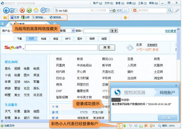 “漫游”收藏夹的方法:首先注册一个通行证账号(网络账户),然后用该账号登陆浏览器,您就可以使用网络收藏夹了,如图所示。所有的收藏项都将被保存在网上,您无论在哪里上网,只需登陆通行证账号即可访问网络收藏夹中的收藏。