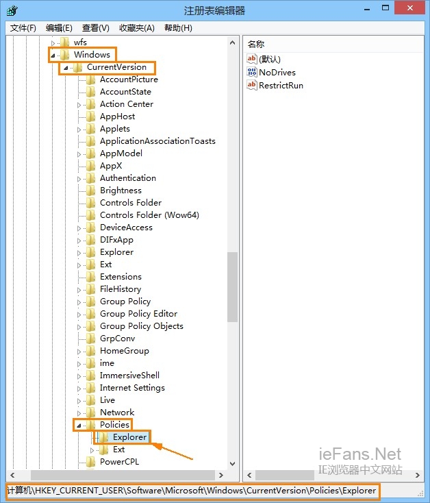 步骤二:在左侧列表中展开到如下路径:HKEY_CURRENT_USERSoftwareMicrosoftWindowsCurrentVersionPoliciesExplorer
