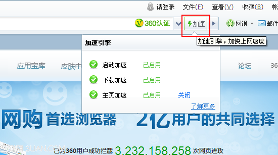 加速引擎主要包含启动加速、下载加速、主页加速、网络加速等功能,这些功能可以加快您浏览器上网和下载的速度。