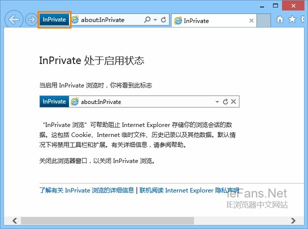 只要是在这个窗口里面浏览网页,将会阻止IE浏览器保存你的浏览会话的数据。这包括 cookie、Internet 临时文件、历史记录以及其他数据。通俗的说,就是在这个窗口浏览任何网页都不会留下任何痕迹。