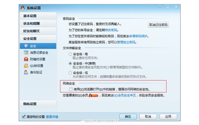 您可以打开QQ(QQ2011版本以上)的系统设置面板,在安全设置-安全-网络安全中取消勾选即可,如下图所示: