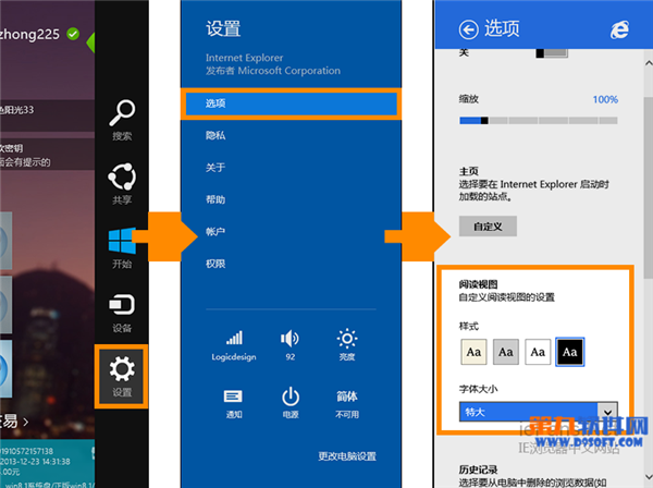 你可以自定义设置“阅读视图”模式下页面的背景颜色和字体大小,当在 IE11 中开启“阅读视图”模式后,将鼠标移动到屏幕右上角或右下角,调出“超级按钮”,选择“设置”,然后点击“选项”,即可在“选项”菜单中根据你的需要进行设置。