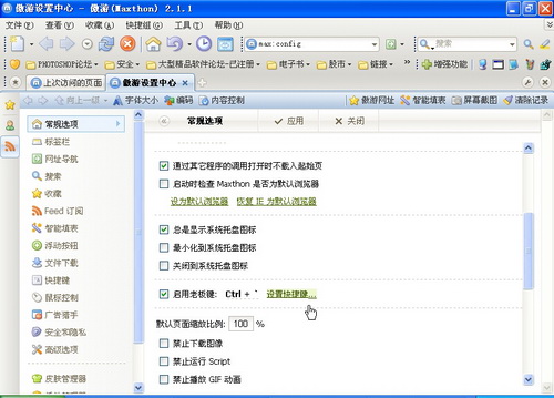 当然对于软件默认的快捷键,用户还可以通过更改设置来自行定义:同样打开“傲游设置中心”页面中的“常规选项”子页面,在其中的“启用老板键”里即可进行快捷键的更改了(如图4)。