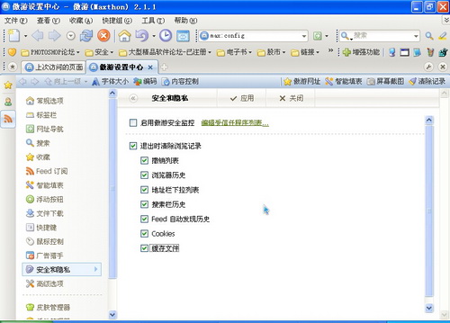 用户将打开的“傲游设置中心”页面切换到“安全与隐私”子页面,在该子页面中软件列出了“退出时自动清理浏览记录”的包括撤消列表、浏览器历史、地址栏下拉列表、搜索栏历史、Feed自动发现历史、cookies和缓存文件等在内的多项历史记录自动清理功能,用户可以根据需要有选择的进行配置和自动清理(如图6)。