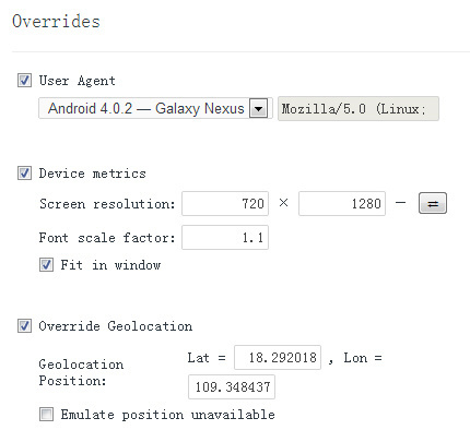 如果再把把右边的Override Geolocation也勾上,就可以模拟位置了,但需要我们自己设置位置坐标。步骤如下:
