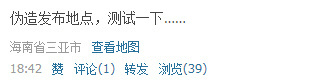经测试,腾讯微博也可以伪造发布地点,但新浪微博我尝试了几次均未能成功,有的网友说是发布成功了。最后看看我从三亚“天涯海角”发来的说说: