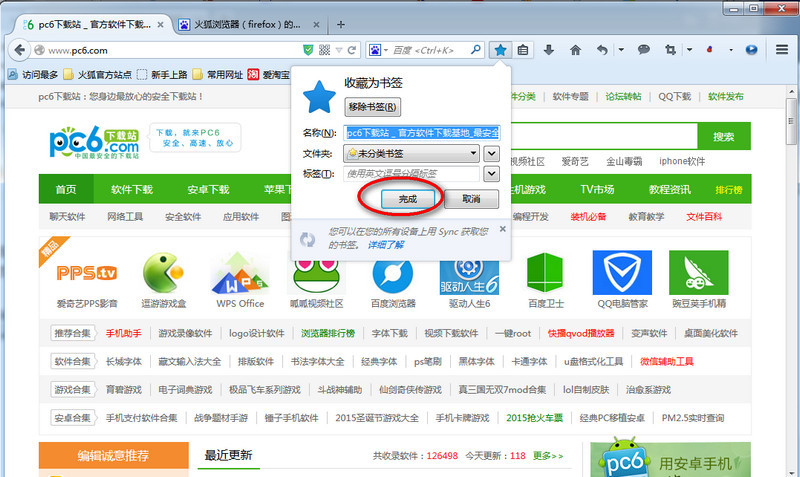 2、然后我们点击这个“收藏”工具按钮,会弹出收藏为书签对话框点击“完成”。