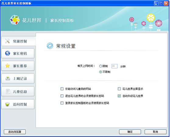 分为六个频道:常规控制、家长密码、家长推荐和上网记录。