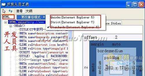 IE8不仅仅增加了源剪辑、活动等面向终端用户的新功能,同时为开发者提供了一个相当不错的开发人员工具,并且针对IE7的部分功能进行了改进与更新,包括安全性筛选滤器和新版的加载项管理器。在IE8界面点击工具栏最右侧的鼠标指针按钮,或者直接按下“Alt+Y”快捷键,就能打开微软内置的开发人员工具。(图8)