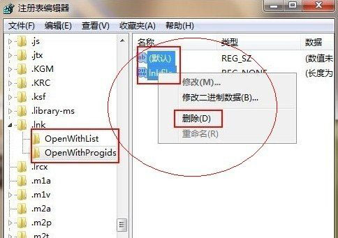 如上图,然后将除了openwithlist和openwithprogids两项外,其他的选项将其删除,并且再将openwithlist和openwithprogids内的除默认值项都删除,保存退出即可。