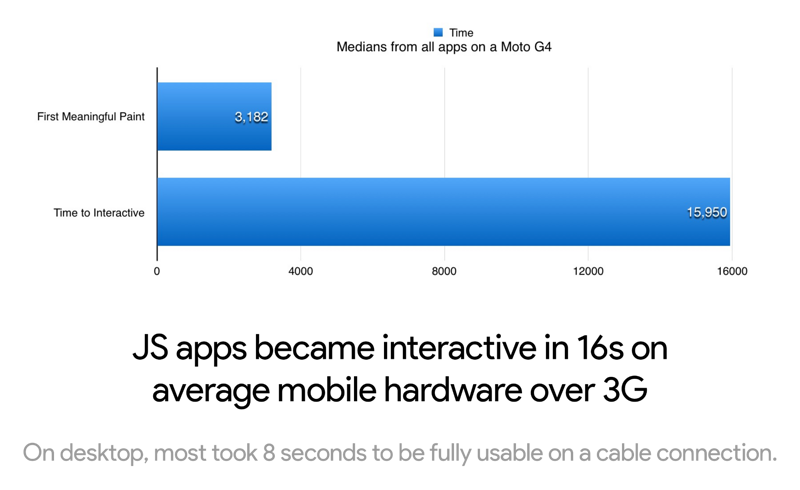 底会对其他网站造成什么样的影响呢?对于这个问题我也很好奇,于是我花费了两个月的时间对于超过 6000 个网站进行分析;这些网站囊括了 React,Angular,Ember,Vue 这些流行的框架或者库。大部分的测试是基于 WebPageTest 进行的,因此你可以很方便地重现这些测试结果。光纤接入的桌面浏览器大概需要 8 秒的时间才能允许用户交互,而 3G 环境下的 Moto G4 大概需要 16 秒 才能允许用户交互。