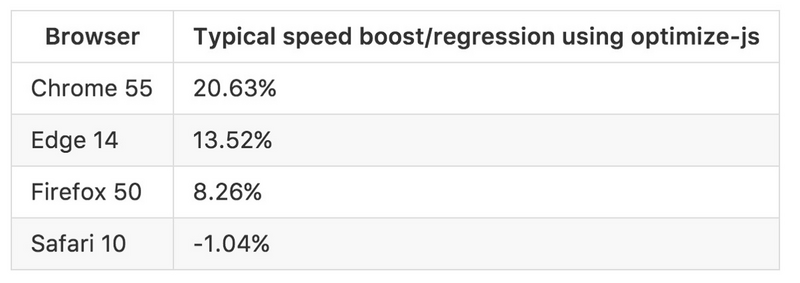 预编译能够通过只处理那些浏览器运行所需要的最小函数集合来提升启动时间,不过这种机制在 IIFE 面前却反而降低了效率。尽管引擎希望避免对这些函数进行预处理,但是远不如optimize-js这样的库有作用。optimize-js 会在引擎之前对于脚本进行处理,对于那些立即执行的函数插入圆括号从而保证更快速地执行。这种预处理对于 Browserify, Webpack 生成包体这样包含了大量即刻执行的小模块起到了非常不错的优化效果。尽管这种小技巧并非 V8 所希望使用的,但是在当前阶段不得不引入相应的优化机制。