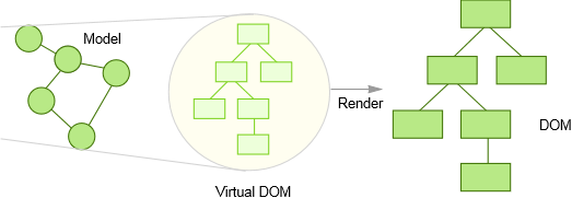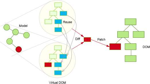 纯React通过重新渲染整个UI到一个?新的虚拟DOM,然后和旧的虚拟DOM做比较来检测数据改变。发现有什么改变了,然后作为修订发送给真实DOM。