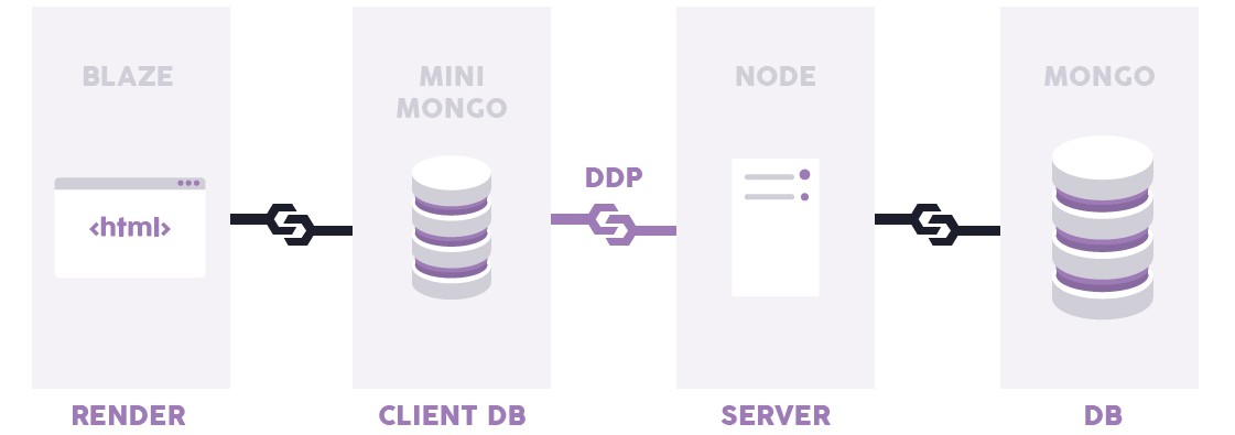 此外,Meteor特别适合于那些想要构建实时web app的开发人员。所有从数据库到模板的app层都会自动更新。这是它的工作原理——