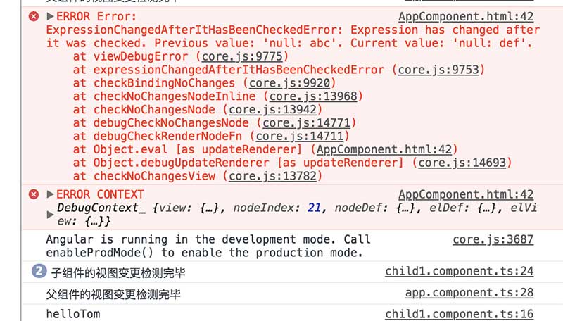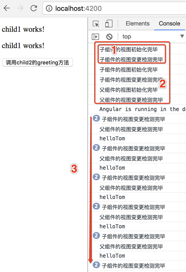 看2中,因为父组件中声明了2个子组件,所以看到有2个子组件 初始化的动作。1号子组件初始化完毕,变更检测完毕,2号子组件初始化完毕,变更检测完毕后,父组件的初始化完毕才会被调用,然后父组件的变更检测完毕才会被调用。