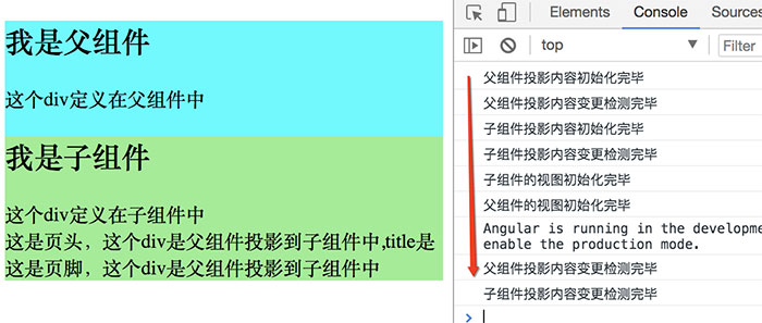 ngaftercontentinit,ngaftercontentchecked是在被投影进来的内容组装完成后调用的。