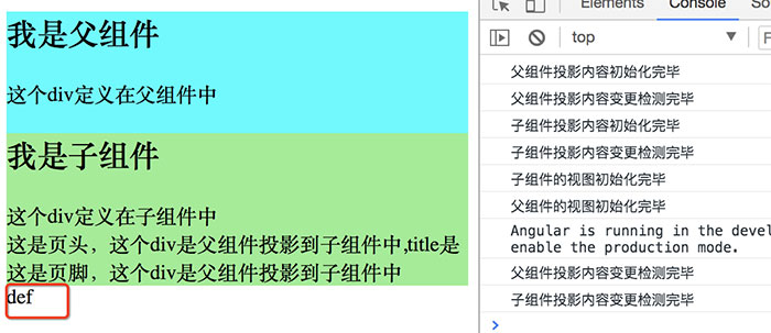 组装视图时,先组装投影进来的内容,然后组装子组件中视图的内容,再加上父组件本身的内容,然后才是父组件视图初始化完毕。