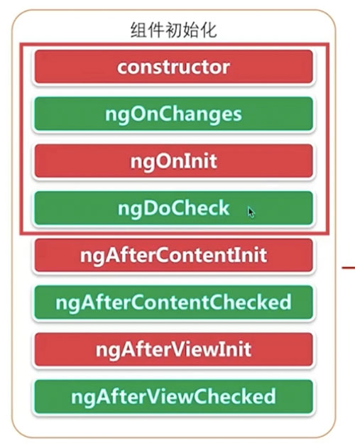 上面四个方法在属性初始化阶段:构造函数是初始化对象,ngonchanges是初始化输入属性,ngoninit是初始化除了输入属性以外其它的所有属性,ngdocheck是做一次变更检查。