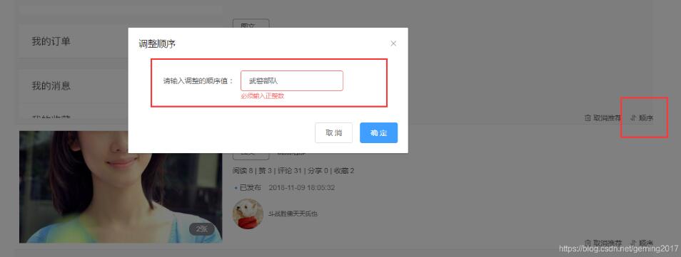 如果一个页面有多个按钮打开相同的element-ui的dialog对话框,那么如果第一个点击"顺序"按钮出现红色验证提示语后, 再点击“取消”,或者点击页面空白处此对话框消失,而后再点击同一个“顺序”按钮亦或别的“顺序”按钮, 那么此红色提示依然存在,显然是无法忍受的,那么怎么去除呢,