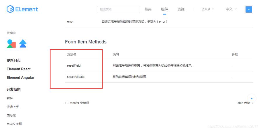 在 “ 代码二 ” element-ui中定义一个 ref="form" 起到参照的作用(reference),watch中的form与此相对应,resetfields取自element-ui官网上的form表单里的方法名, 看 “ 图二 ”官网截图