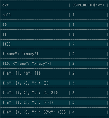 计算 json 深度,计算方式 {} [] 有一个符号即为一层,符号下有数据增加一层,复杂 json 算到最深的一次为止,官方文档说 null 值深度为 0,但是实际效果并非如此,列举几个例子